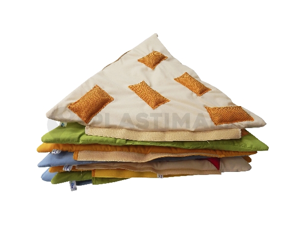 Entretenida alfombra de tela con texturas, compuesta por 8 módulos en forma de triángulo equilátero. Permite trabajar como huella para crear caminos alternativos, ya sea en forma lineal o en zigzag. Favorece la estimulación sensorial y el desarrollo motriz a través del juego activo.