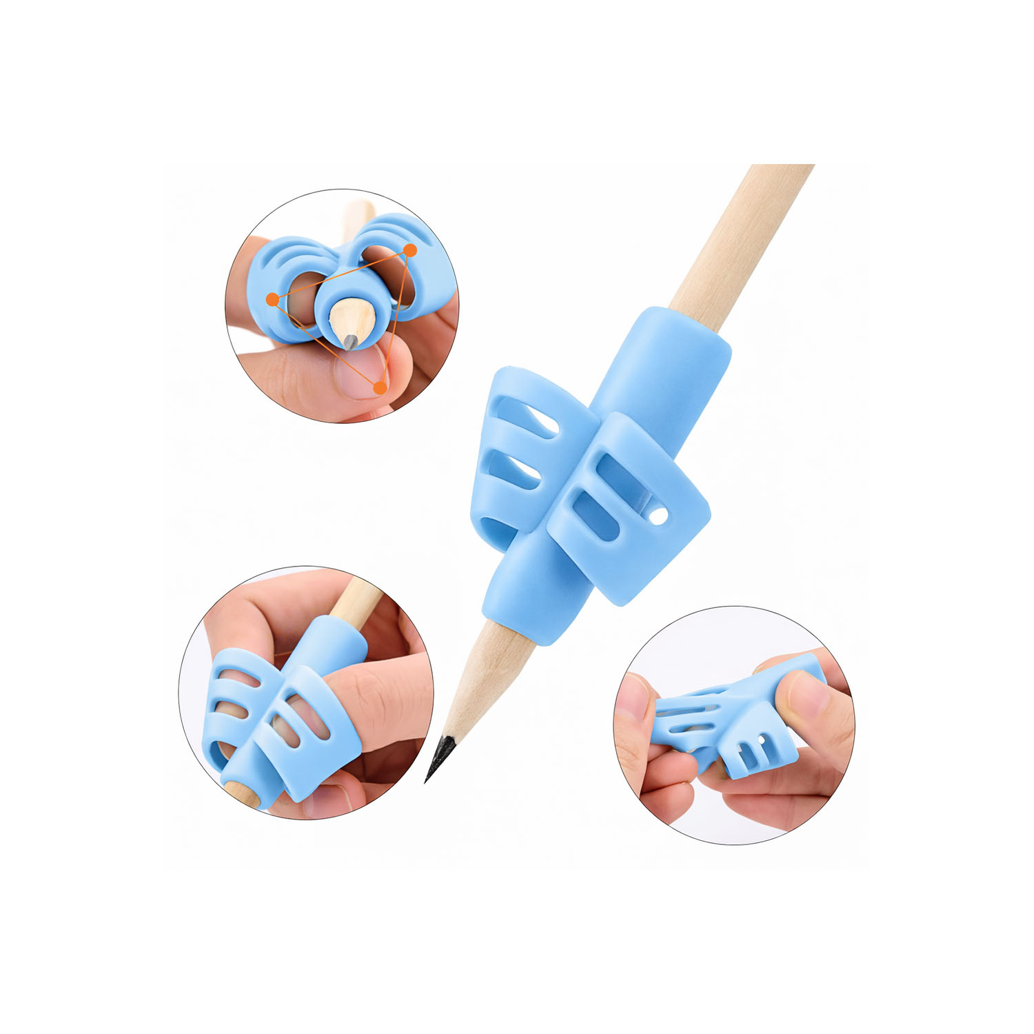 Accesorio ergonómico diseñado para guiar la correcta posición de los dedos al tomar el lápiz, facilitando el desarrollo del agarre tipo trípode dinámico. Su uso apoya el aprendizaje de la escritura, promoviendo una postura adecuada de la mano, mayor control y precisión en el trazo.