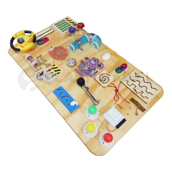 Tablero sensorial basado en el método Montessori, diseñado para estimular el desarrollo de habilidades motrices finas, el pensamiento lógico, la memoria, la atención plena y la creatividad. Incorpora 45 accesorios interactivos como xilófono, laberinto con imán, elementos de motricidad fina con base, cierre, luces flash, pestillos, interruptores, tip-top, velcro, argollas, rueda, cordones, cerraduras, recorridos, encajes, teléfono, entre otros.