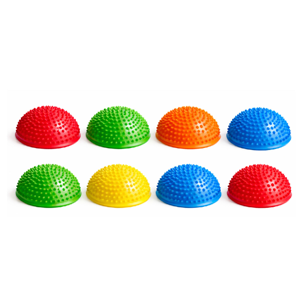 8 semiesferas inflables en colores amarillo, verde, azul y rojo.
