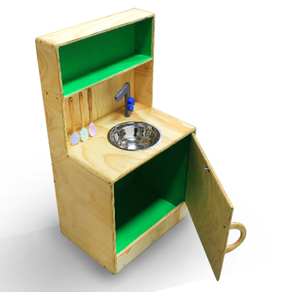 Lavaplatos de madera diseñado para el desarrollo del juego de roles en niños y niñas, orientado a estimular la imaginación, la creatividad y la interacción en contextos educativos y recreativos. Su estructura permite la simulación de actividades cotidianas, favoreciendo la autonomía y la representación simbólica a través del juego libre o guiado.
