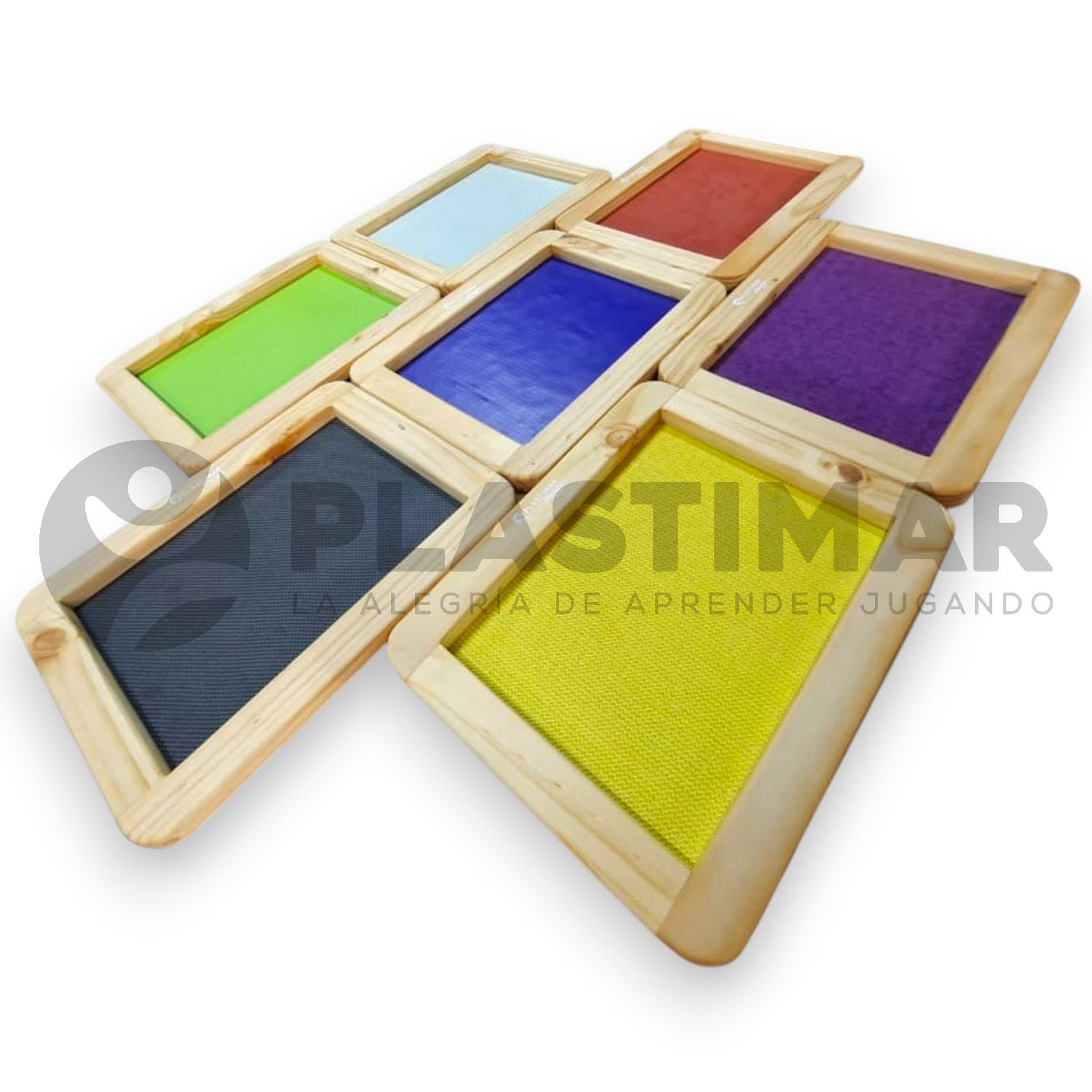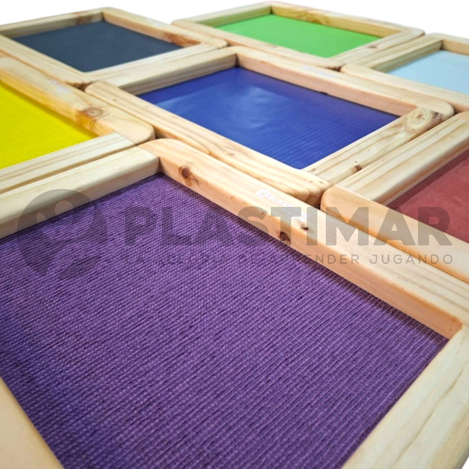 Cada rectángulo incorpora superficies con texturas variadas como pasto sintético, goma, alfombra y materiales rugosos, favoreciendo experiencias de discriminación táctil mediante el juego libre o guiado. El sistema de ensamblaje con tarugos de madera permite una unión segura sin elementos metálicos, aportando estabilidad y seguridad durante su uso.