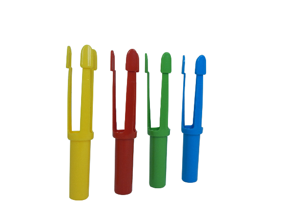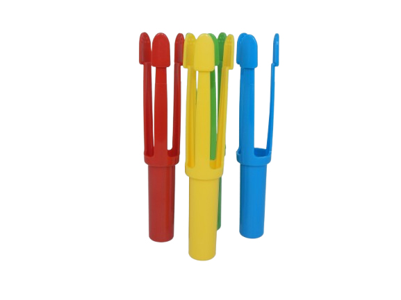 Set de 4 pinzas de plástico en colores variados, diseñadas para actividades educativas, recreativas y terapéuticas. Su uso favorece el desarrollo de la motricidad fina, la coordinación óculo-manual y el fortalecimiento de los músculos de la mano.