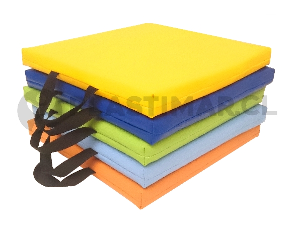 Set de cojines cuadrados de colores, cómodos y diseñados para uso en el piso. Incorporan manilla resistente que facilita su manipulación, traslado y guardado. Ideales para espacios educativos, lectura y actividades grupales.