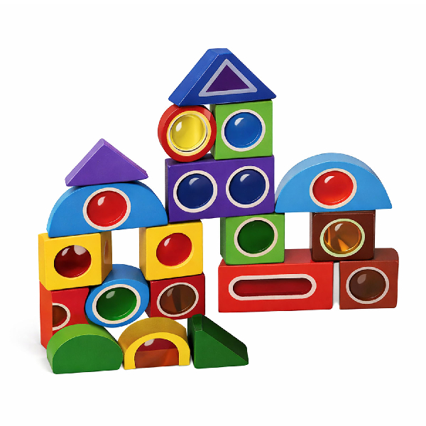 24 bloques de madera en variadas formas y colores, 20 bloques con prismas acrÃlicos de colores y 4 bloques sin prisma.